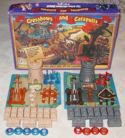 Which makes sense, flinging things around is a classic game: Crokinole or Carrom. Crossbows and Catapults took that and made it kid-friendly and somewhat trendy (tying into the Dungeons and Dragons craze).