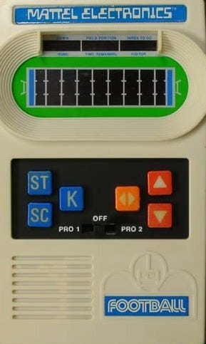 I never had an Atari game system as a child1… that was something I only got to play at sleep-overs or a cousin’s house. Eventually (as children measure these things) we got an Intellivision. But even in those early days of computer and electronic gaming I did manage to get my hands on a Mattel Electronic Football game.