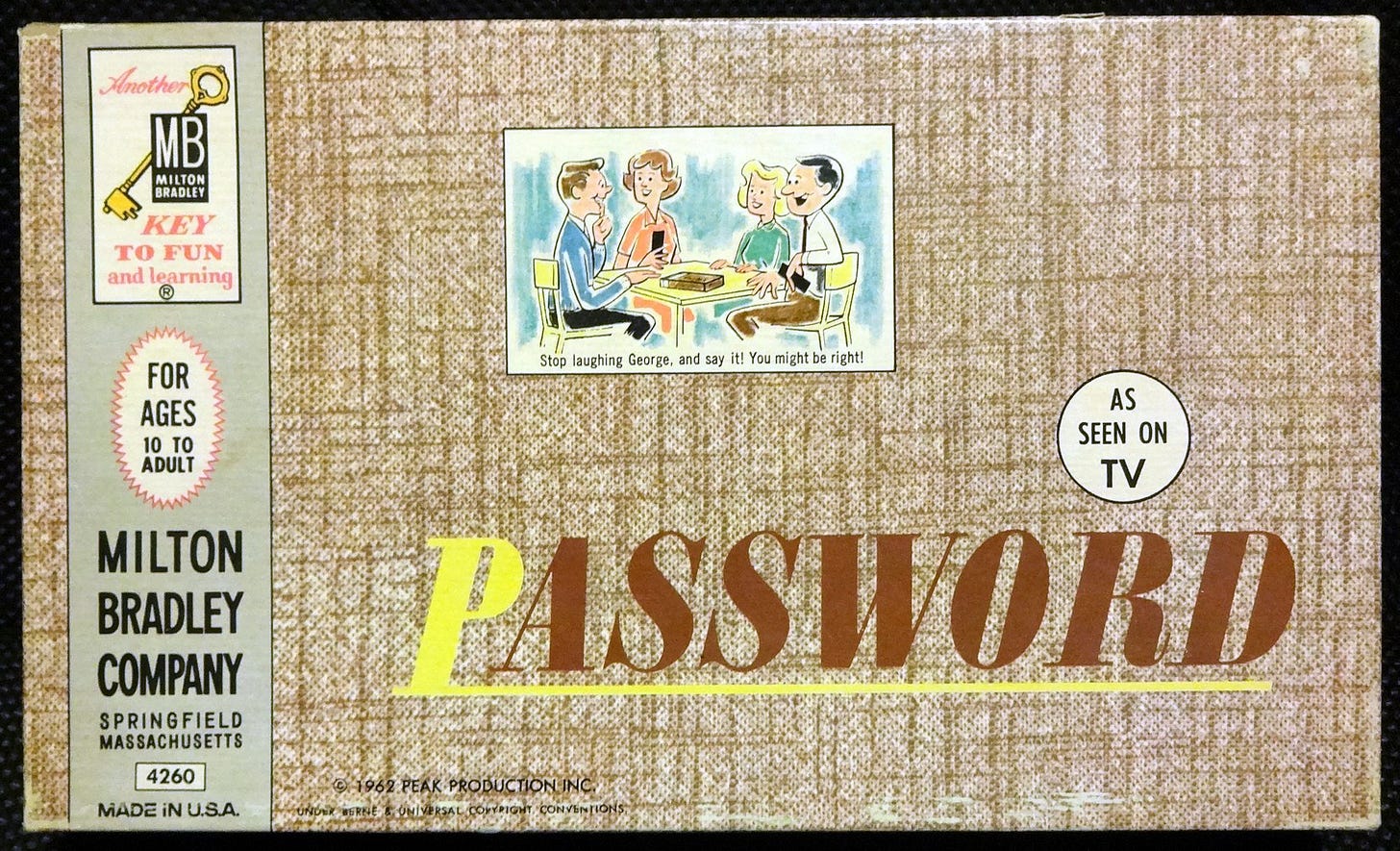 Hollywood (always happy to avoid inventing something new) recently brought back Password as a game show; no doubt more board game editions have hit the shelves (or will, soon enough). Given modern trends, I doubt they’d plaster “94th edition” (or whatever it is) on it, but it’s still around over fifty years after it was first published.