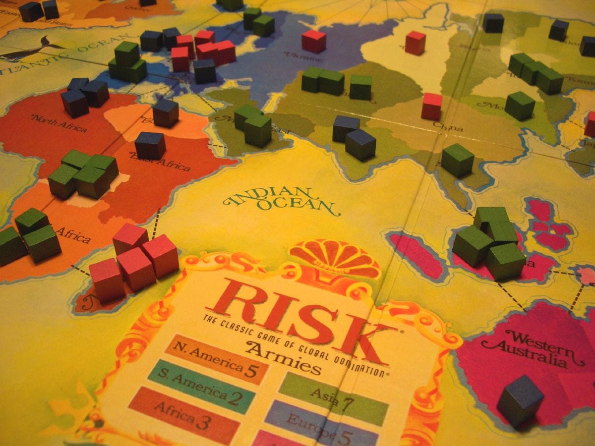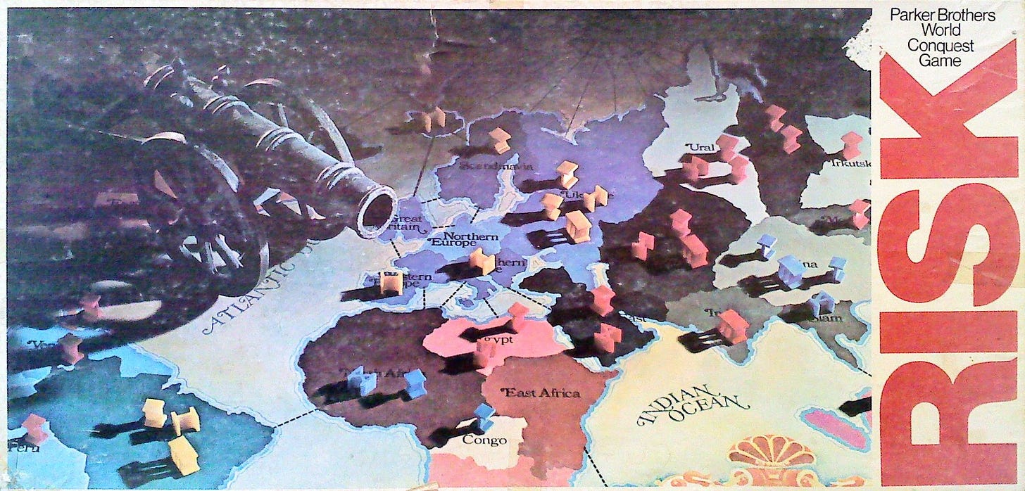 It’s a rare person who keeps playing games as an adult4. But everyone I knew as a kid played games, and the one game that everyone seemed to have played was Risk. Really, there’s not much to say. It’s practically everyone’s introduction to the “Dudes on a map” game: a bunch of kids sitting around chucking dice to kill the other guys armies, until one kid has taken over the world.